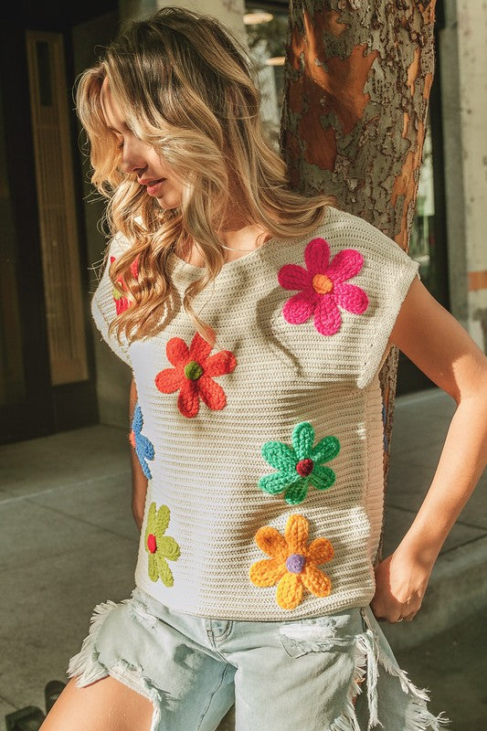Be the talk of the town with our Bibi Crochet Flower Sleeveless Knit Top! This cute, fun, and unique top is sure to make you stand out in a crowd. Have fun and be yourself with this playful and quirky addition to your wardrobe. (Warning: may induce fun-filled adventures!)