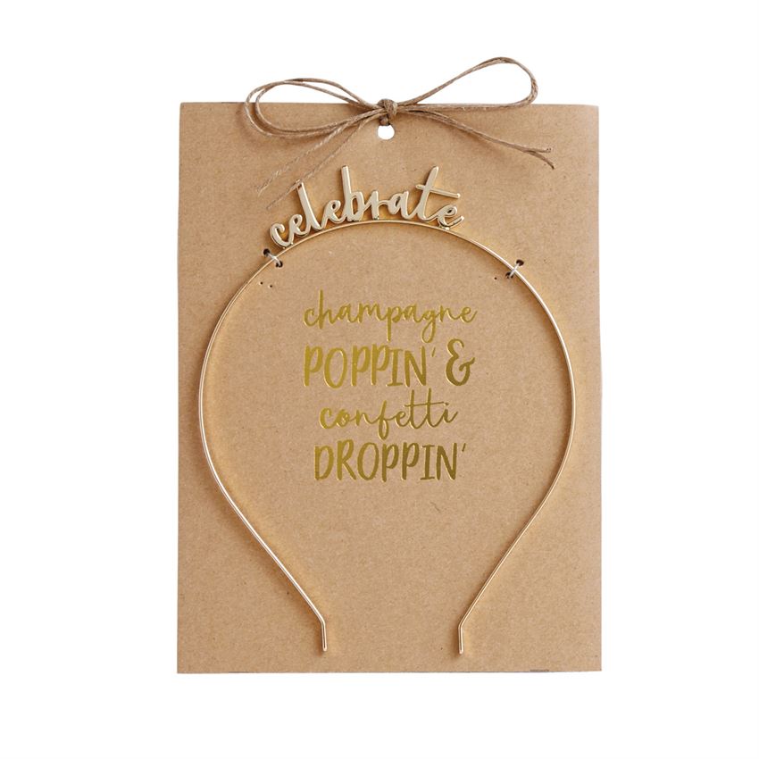 Gold plate metal headband features "celebrate" scripted topper and arrives on foiled display card.