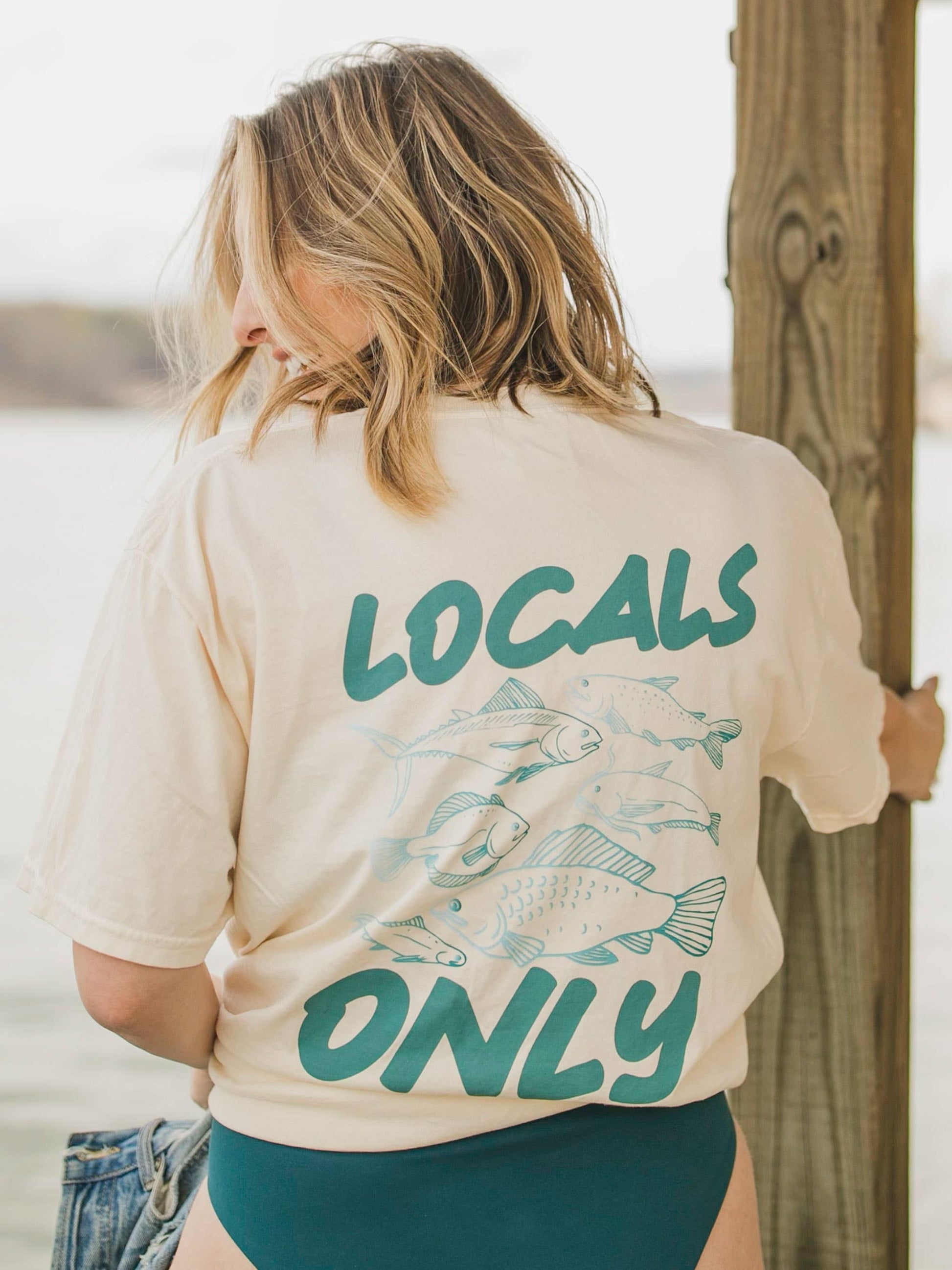 Every year for our lake collection, we are honored to collaborate with one of our favorite local influencers, Jo Johnson Overbey! These pieces are inspired by her summers spent on the lake and are created with a calm and cool aesthetic in mind. The only locals around these parts happen to have fins and gills, do you think we'll fit in? Become a lake local in this new tee featuring an ivory blank and aqua artwork. You're always welcome at our lakehouse! Pack this one for your next trip to the marina!