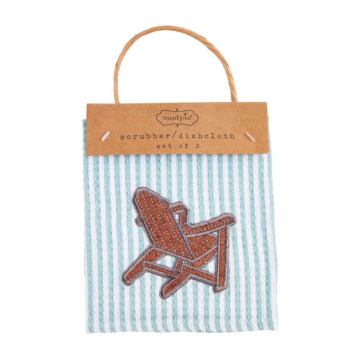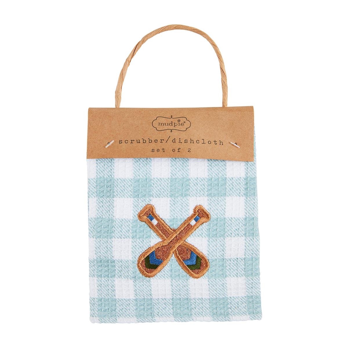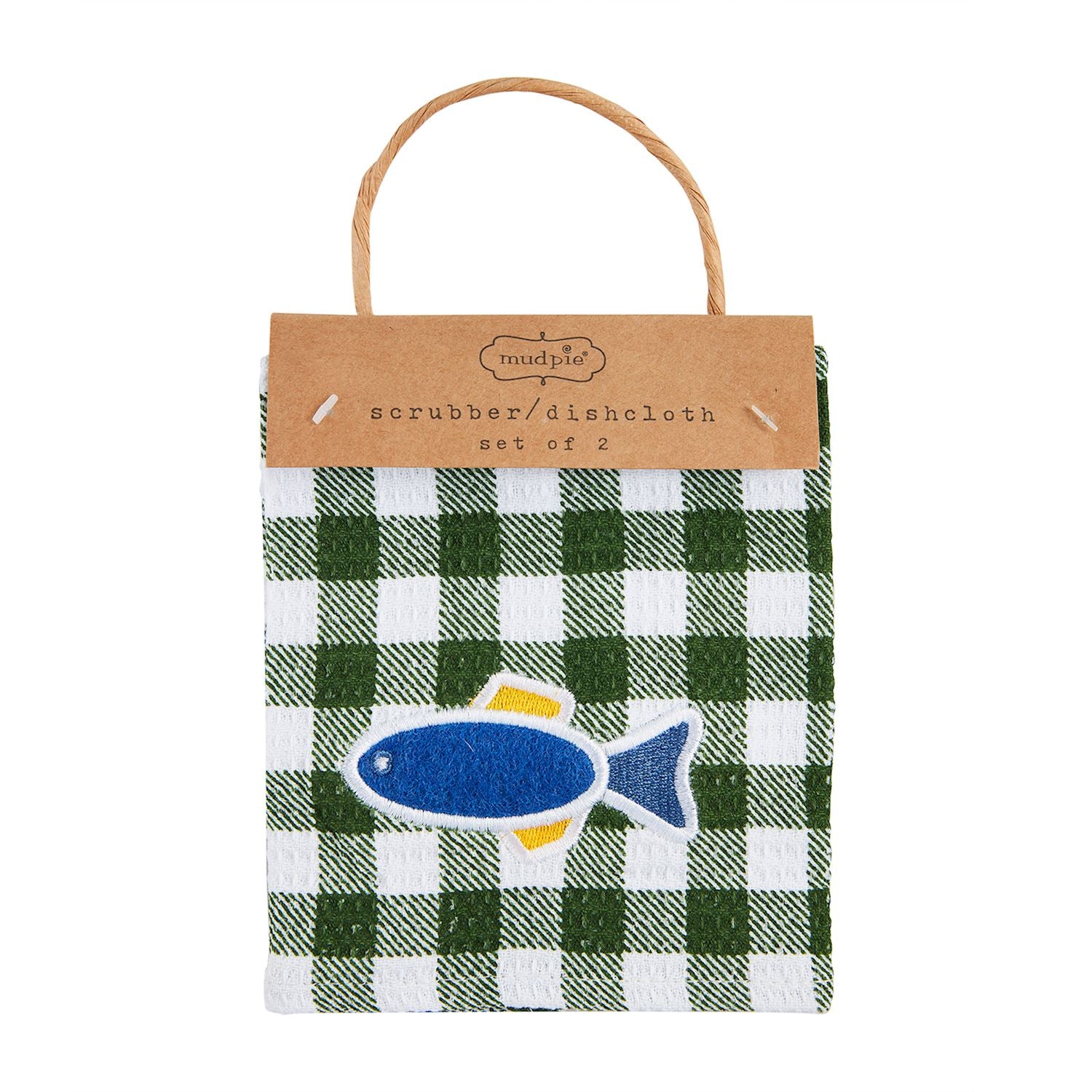Set of two waffle weave dishcloths with scrubby sponge appliques.