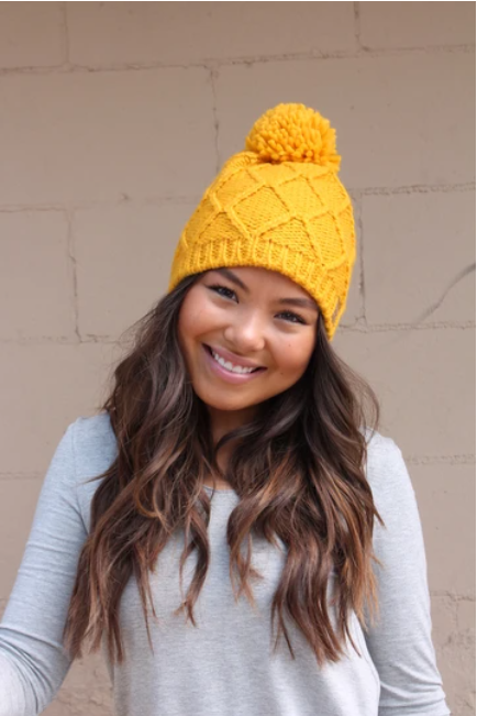 Mustard fleece lined knit hat with pom accent.