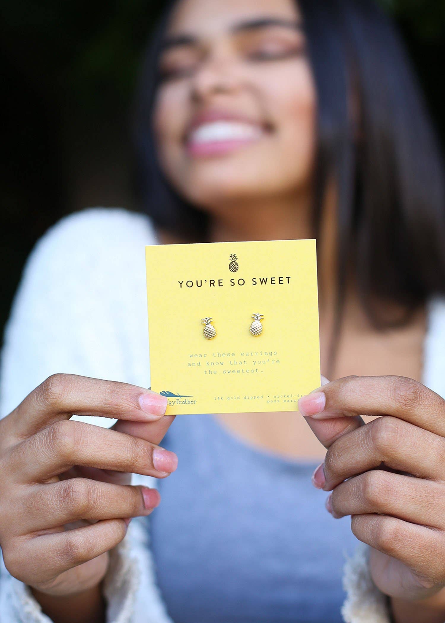 YOU'RE SO SWEET with our dainty gold-plated pineapple studs. Wear them and know that you're the sweetest. A true symbol of friendship and love. All pieces are nickel-free for sensitive skin. Suitable for pre-teens and adults alike.