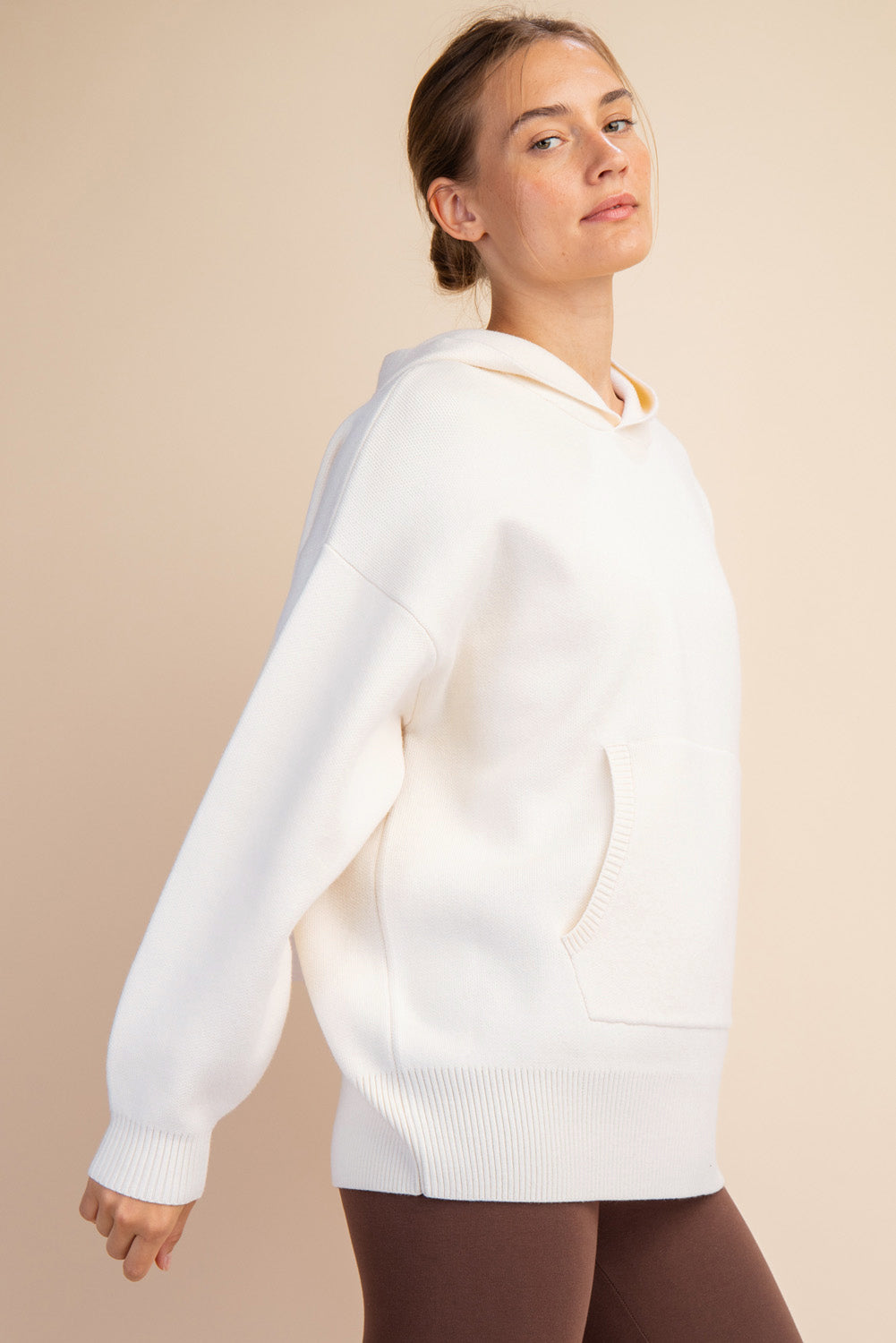 Stay cozy and chic with our hoodie sweater, made from soft and cozy knit fabric. This relaxed-fit, oversized piece features long sleeves with dropped shoulders, a built-in hood, and a kangaroo front pocket. Ribbed cuffs and hem add the perfect finishing touch to this must-have wardrobe staple.