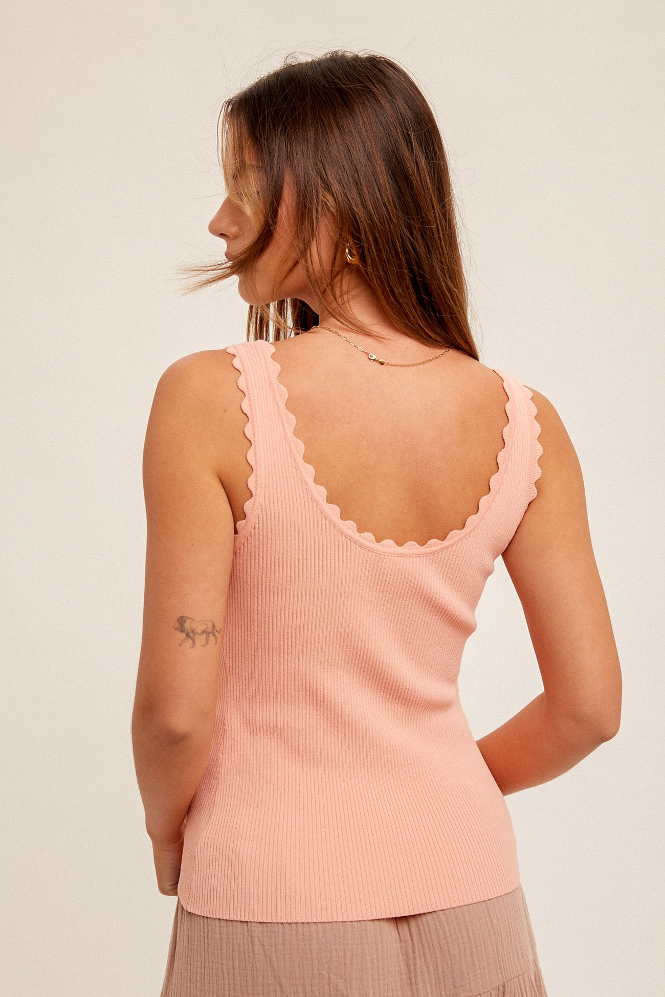 Unleash your fun side with our Scallop Edge Tank Top. Perfect for layering or wearing on its own, this top effortlessly transitions from work to happy hour to weekend adventures. Let loose and have fun in this versatile tank!