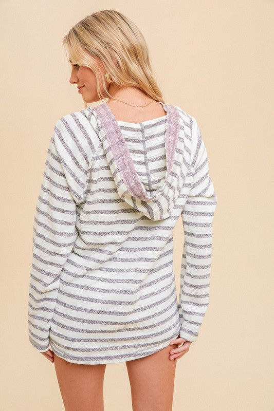 Cozy up your wardrobe with this Stripe with Deep V Neck Pullover! The lavender trim adds a subtle pop of color, making it just "cute" enough to wear for any occasion. It's soft and comfy, so you won't want to take it off! Get ready to be the center of attention!